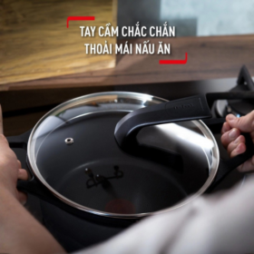 Nắp thủy tinh chịu nhiệt tốt, thiết kế nắp có thể dựng đứng. Khe chắt nước và môi rót tiện lợi. Chấm đỏ báo nhiệt thông minh, báo nhiệt độ lý tưởng để nấu nướng. Đế từ cải tiến Thermo-Fusion bắt từ nhanh, gia nhiệt đều giúp món ăn chín đều. |