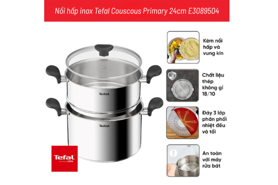Đi theo xu hướng ẩm thực lành mạnh, phương pháp hấp cách thủy đang ngày càng trở nên phổ biến nhờ khả năng bảo toàn tối đa hàm lượng vitamin và khoáng chất có trong thực phẩm. Để hiện thực hóa lối sống “ăn sạch, sống khỏe” đó, chiếc Nồi hấp inox Tefal Couscous Primary 24cm E3089504 đã ra đời như một trợ thủ đắc lực không thể thiếu trong mỗi gian bếp gia đình Việt. Được chế tác từ chất liệu thép không gỉ cao cấp theo tiêu chuẩn Pháp, bộ sản phẩm này không chỉ mang lại vẻ thẩm mỹ sang trọng mà còn khẳng định độ bền vượt thời gian qua từng chi tiết thiết kế tỉ mỉ. Với kích thước 24cm lý tưởng cùng thiết kế 2 tầng tách biệt, bạn có thể dễ dàng thực hiện các món hấp từ tôm, cá, rau củ cho đến các loại bánh truyền thống một cách nhanh chóng và vô cùng thảnh thơi. Sự khác biệt của dòng Primary nằm ở khả năng phân bổ nhiệt lượng đồng đều, giúp hơi nước len lỏi khắp lòng nồi để thực phẩm chín đều từ trong ra ngoài mà không bị nát hay mất đi sắc thái tươi ngon nguyên bản. Sở hữu Nồi hấp inox Tefal Couscous Primary 24cm E3089504 chính là bước đi thông thái giúp bạn nâng tầm chất lượng bữa cơm hằng ngày, biến công việc nội trợ trở thành một trải nghiệm đầy cảm hứng sáng tạo. Hãy cùng tôi đi sâu vào khám phá những đặc tính kỹ thuật đột phá và giá trị thực tế mà siêu phẩm này mang lại ngay trong nội dung phân tích chuyên sâu dưới đây.