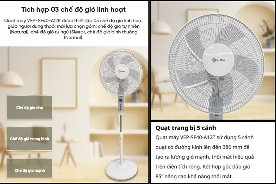 Trong điều kiện thời tiết nóng bức, một chiếc quạt điện chất lượng là thiết bị không thể thiếu trong nhiều gia đình. Quạt đứng là dòng sản phẩm được nhiều người lựa chọn bởi thiết kế linh hoạt, khả năng làm mát hiệu quả và phù hợp với nhiều không gian khác nhau. Quạt đứng E-Pro VEP-SF40-A12T là một trong những sản phẩm được thiết kế nhằm đáp ứng nhu cầu làm mát trong sinh hoạt hằng ngày.