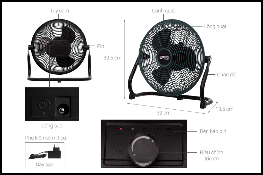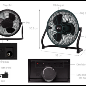 | Tiện ích | Lồng quạt có khe hở nan quạt nhỏ, Có đèn báo khi sạc |