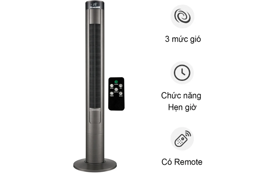 Quạt tháp Shimono SM-TF46LE được trang bị hệ thống điều khiển thiết kế theo hướng tối giản nhưng cực kỳ trực quan, giúp người dùng dễ dàng làm quen ngay từ lần sử dụng đầu tiên. Các nút bấm được bố trí hợp lý trên thân quạt với ký hiệu rõ ràng, hỗ trợ thao tác nhanh chóng mà không cần đọc hướng dẫn quá nhiều. Điều này đặc biệt hữu ích với người lớn tuổi hoặc những người không rành công nghệ.Bên cạnh đó, một số phiên bản của quạt còn đi kèm remote điều khiển từ xa, cho phép bạn điều chỉnh mọi chức năng mà không cần di chuyển. Tính năng này phát huy hiệu quả rõ rệt khi sử dụng trong phòng ngủ hoặc khi bạn đang nghỉ ngơi trên sofa. Việc có thể thay đổi chế độ gió, bật/tắt quạt hay hẹn giờ chỉ bằng một nút bấm giúp nâng cao trải nghiệm sử dụng đáng kể.