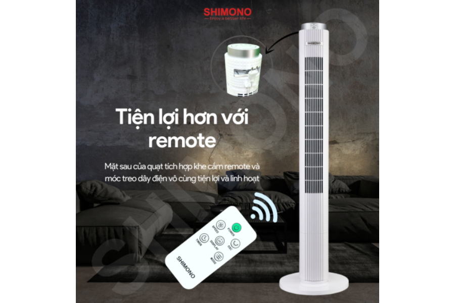 Một trong những điểm cộng lớn của Quạt tháp Shimono SM-TF46LS(B) là khả năng điều khiển từ xa. Người dùng có thể dễ dàng thay đổi chế độ, tốc độ gió hoặc hẹn giờ mà không cần di chuyển. Đây là tính năng rất hữu ích khi sử dụng trong phòng ngủ hoặc khi đang làm việc. Remote đi kèm được thiết kế nhỏ gọn, dễ sử dụng với các nút chức năng rõ ràng. Điều này giúp người dùng nhanh chóng làm quen và thao tác dễ dàng.