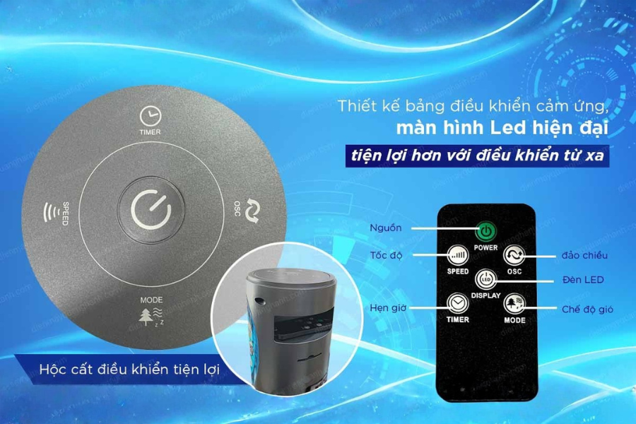 - 3 mức điều khiển công suất, 4 chế độ: quạt thường, gió tự nhiên, chế độ ngủ, trẻ em