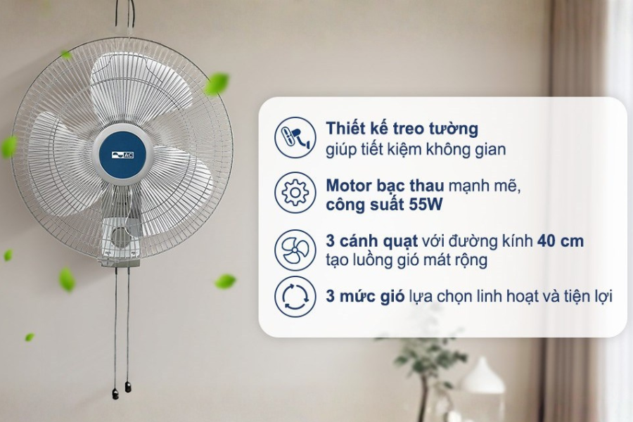 Quạt treo tường AC AWF03A163 55W là dòng quạt điện được thiết kế chuyên biệt cho nhu cầu làm mát trong các không gian cần tối ưu diện tích. Khác với quạt đứng hay quạt bàn, sản phẩm được lắp cố định trên tường, giúp giải phóng không gian sàn và tạo sự thông thoáng cho khu vực sử dụng.