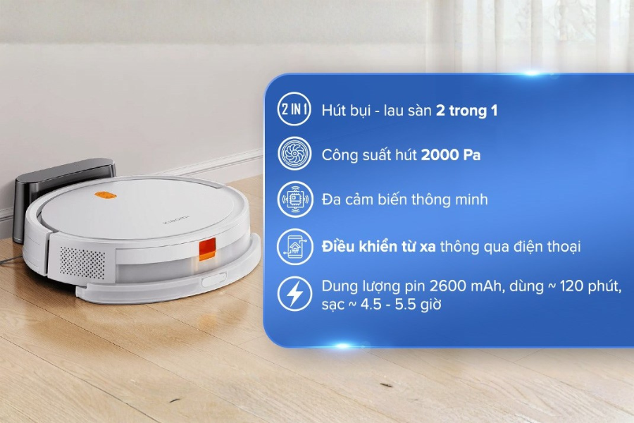 Một trong những điểm khiến Robot hút bụi lau nhà Xiaomi Vacuum E5 Trắng EU được ưa chuộng chính là khả năng làm sạch 2 trong 1. Thiết bị vừa hút bụi vừa lau sàn trong cùng một chu trình, giúp tiết kiệm thời gian và công sức đáng kể so với việc dọn dẹp thủ công.