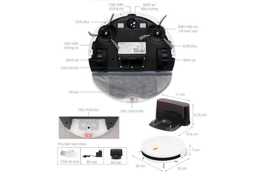Ngoài ra, sản phẩm còn được trang bị bánh xe linh hoạt, giúp vượt qua các bề mặt gồ ghề hoặc thảm mỏng một cách dễ dàng. Thiết kế này giúp robot di chuyển mượt mà giữa các khu vực mà không cần can thiệp thủ công. Hộp bụi và bình nước được tích hợp trong cùng một khối, giúp tiết kiệm không gian và dễ dàng tháo lắp khi vệ sinh. Đây là điểm cộng lớn giúp người dùng sử dụng thuận tiện hơn trong quá trình bảo trì thiết bị. Tổng thể thiết kế hướng đến sự đơn giản nhưng vẫn đảm bảo tính thực dụng cao.