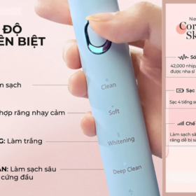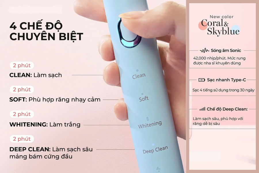 | Chế độ làm sạch | 4 chế độ (Làm sạch, Làm trắng, Răng nhạy cảm, Làm sạch sâu) | ||